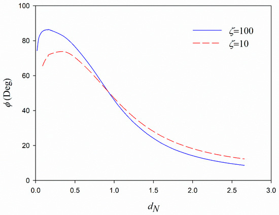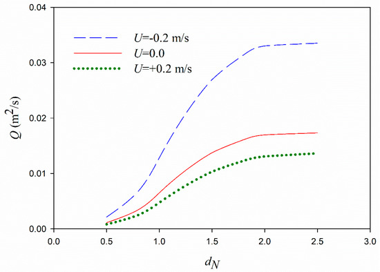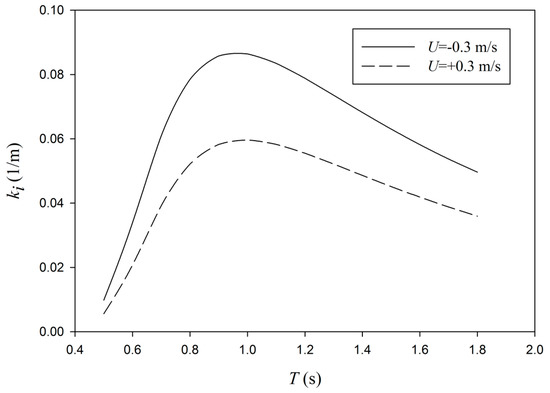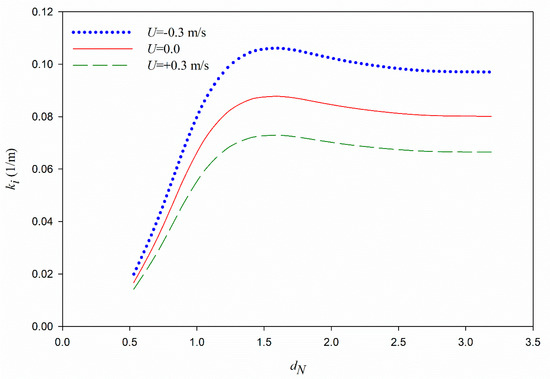 The variations of dissipation rates versus current velocity confirm the conclusions from Figure 3 that by a shift from negative to positive values of current velocity (i.e., opposing current to the following current), the dissipation rates decrease (Figure 5). This is because opposing current results in the smaller values of wavelengths, while the following current makes bigger wave lengths. Therefore, the wave number induced by the opposing current increases, and a higher wave attenuation rate is observed [10]. It is also directly observed from Equation (39) that the dissipation rate is a function of coefficient B and since the coefficient B is a function of relative frequency, ω (the first term at the right-hand side of Equation (38)), by an increase in the current velocity, the dissipation rate is decreased, which was not presented in previous analytical models. Dissipation rates versus dimensionless mud thickness, dN shows a local peak (Figure 6), which is the comparable to the local peak presented by the viscous models (e.g., [11,12,15,23]) with the difference in the inclusion of current effects in the equations and results. The local peak also exists for the dissipation rates versus the wave period (Figure 7). The viscous models predict one local peak for the variations of wave dissipation rates versus the period and dimensionless mud thickness (e.g., [11,25]). Although the current does not change the trends, the values of the dissipation rates are affected by the currents (Figure 6 and Figure 7).
