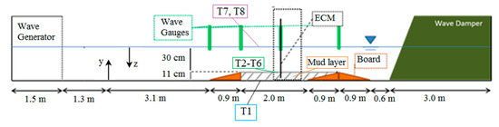 Phenomena relevant to the water–sediment systems are of great importance in the coastal zones all over the world. Therefore, water–sediment interaction should be studied from different perspectives, e.g., coastal protection, land reclamation, and water quality management [1]. Some parts of the coasts including estuaries and mouths of large rivers are mainly covered by the soft mud (Lousiana coast [2]; Brazil [3]; South Korea [4]; and Iran [5]). The current exists in most of the cases in the fields of water-mud systems, especially in the confluences of large rivers and estuaries (e.g., Ems estuary [6]; Southampton water estuary [7]). The current substantially affects the two major aspects of wave mud interaction: wave attenuation, and mud mass transport, which are highly influential in the coastal systems in the environmental, engineering, and management aspects [1]. While both wave attenuation and mud transport affect the designing of the harbors and ports [8], the mud mass transport may also cause some environmental issues by carrying the pollutant species toward the coasts [9]. The current influences a wave field by shifting the frequency and changing the amplitude, and it plays a significant role in the development of the waves of unusual character. Current can also refract waves, change the direction of wave propagation, and consequently affect the nearshore hydrodynamics [10].