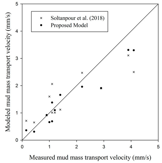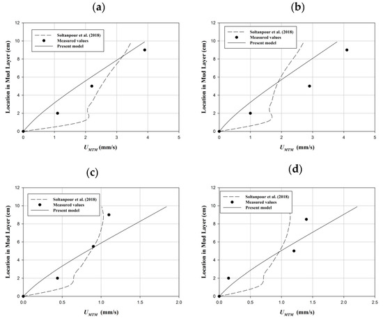 Despite numerous research efforts on wave-mud interactions ([9,16,29,30,31,32,33,34] in addition to the above-mentioned studies), very few analytical and numerical studies have been carried to formulate the effects of current on the wave–mud interactions. Nakano [35] employed an extended multi-layered fluid system to model wave–current–mud interaction. The model did not include a straightforward formula for the mass transport induced by wave-current interactions. An and Shibayama [26] conducted some laboratory wave flume experiments to observe wave–mud interaction with the current. Wave height attenuation rates and vertical distributions of mean velocities were measured. The numerical model and laboratory experiments revealed that both the wave attenuation rate and mud mass transport, decrease in the following current and increase when an opposing current is applied. Zhao et al. [1] presented a numerical and experimental study on wave–current–mud interactions. It was assumed that the mud is soft, the shear stress is capable of moving the mud particles, and the current penetrates the mud layer. Therefore, it was mentioned that the mud mass transport is increased by the following current and vice versa. More recently, Soltanpour et al. [10] provided a combined experimental and semi-analytical study to investigate the current effects on wave–mud interactions. It was assumed that in the ranges of the viscosities applied in their study (e.g., mud viscosity, νm = O (0.01 N/m2)), the current does not penetrate the mud layer, and the measurements confirmed such an assumption.