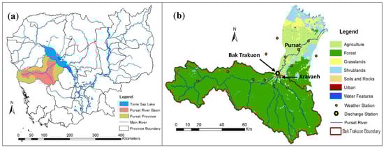 The Pursat River Basin, located in Pursat Province of Cambodia, is one of the Tonle Sap sub-basins and drains an area of 5955 km2 [21] (Figure 1a). The river flows for approximately 150 km from the Southwest at the Cardamom Mountains to the Northeast direction until the Tonle Sap Lake with a basin elevation ranging between 6 and 1717 m above sea level. There is an operating hydrological station named Bak Trakuon with a drainage area of 4245 km2 [22] where this study focused on (Figure 1b). More than 75% of the river basin encompasses a hilly terrain, with an elevation greater than 30 m above sea level and is covered by forested land of varying density, while the remaining low-lying land is occupied by agriculture [23]. Those over 75% of the forest cover are mainly concentrated in Bak Trakuon drainage boundary (Figure 1b) where the major soil types are Dystric Leptosols and Dystric Leptosols/Dystric Cambisols (LPd and LPd/CMd) and Gleyic Acrisols/Plinthic Acrisols (ACg/ACp) [22]. The climate in Pursat River Basin is influenced by tropic monsoon systems with distinct wet and dry seasons. The wet season, which extends from May to November, receives approximately 90% of the total annual rainfall. The dry season, which extends from December to April, is characterized by the prevalence of hot and dry air [22]. The rainfall in the area increases with elevation, but the annual totals vary considerably from year to year with the average ranging from 1200 to 1700 mm [24]. Daily maximum temperatures vary between 36 °C during the hottest months (April–May) and 32 °C during the coldest months (December–January). Daily minimum temperatures vary between 25 and 17 °C. The annual average temperature is approximately 28 °C. The monthly mean relative humidity ranges from 66% in the dry season to 71% in the wet season with a mean annual humidity of 70% [22].
