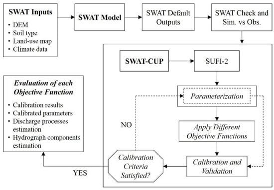 Figure 2 shows the workflow diagram for this study. To simulate hydrological processes in the river basin using the SWAT model, input data, such as DEM, soil type, land-use map, and climate data, were required. The simulation output of the model without any calibration is called the default/initial result. The initial result was checked by using the SWAT Check program to identify any potential model problems, and the simulated discharge was compared with the observed data. If there was a problem or a huge difference between the simulated and observed data, the model inputs (e.g., spatial data, rainfall) need to be focused on, and if there were no problems, model calibration/uncertainty analysis was performed. SWAT-CUP with SUFI-2 algorithm was employed to conduct the model calibration/uncertainty analysis. This process started with parameterization in which several parameters were selected with indication of their value ranges. This was based on the difference between the simulated and observed data, watershed characteristics, and literature reviews. The next step involved applying different objective functions before beginning the calibration and validation. The results of the calibration and validation were evaluated. If the criteria was not satisfied, parameterization was rechecked; then, the model was recalibrated and revalidated. After the calibration and validation process using different objective functions, each objective function was evaluated based on its calibration result, calibrated parameters, the estimation of discharge processes, and the simulation of the hydrograph components. The details of each step are described in the following sections.