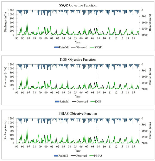 Figure 3 graphically represents the best simulated discharges on the monthly time step (calibrated from 1995 to 2008 and validated from 2009 to 2015) of different objective functions compared with the observed data. The simulated discharges corresponded well with the rainfall data. With the R2 objective function, the calibrated model usually overestimated peak flows. When bR2 was used, the peak flow estimation became even more overestimated compared to the observed data. This originated from the equations of these objective functions. Both are defined by a minimization of total errors from a linear regression model and the length from the average value, which are not direct errors of measured and estimated data and could have the effect on the calibrated parameters. According to Legates and McCabe [45], owing to the squared differences in their equations, they are oversensitive to high extreme values and insensitive to additive and proportional differences between model predictions and measured data.
