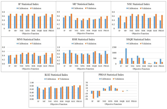 The strengths of the calibration and validation of each objective function were evaluated. The evaluation was based on statistical indices of all objective functions used in this study. The detailed descriptions and equations are presented in Table 3, and their statistical ranges, optimal values, and satisfactory values are shown in Table 4. The satisfactory threshold values for bR2 and MNS were considered greater than or equal to 0.4, which was adopted from Kouchi et al. [20], who introduced measures based on the results of the studies of Muleta [37], Mehdi et al. [38], and Akhavan et al. [39]. For the SSQR, a satisfactory value could not be specified because the measured and simulated variables were independently ranked, and the value depends on the magnitude of the variables being investigated. Satisfactory values of the other indices were based on Moriasi et al. [32] and Thiemig et al. [40].