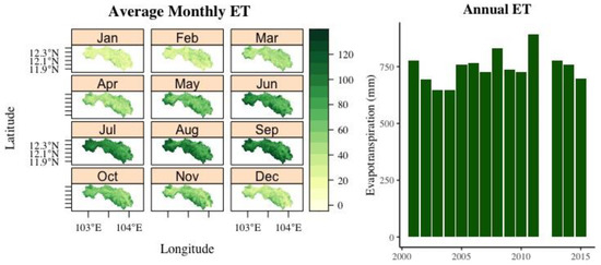 Average monthly (left) and annual evapotranspiration (right) in Pursat River basin (drainage area at Bak Trakuon outlet) from 2001 to 2015 obtained from MODIS ET.