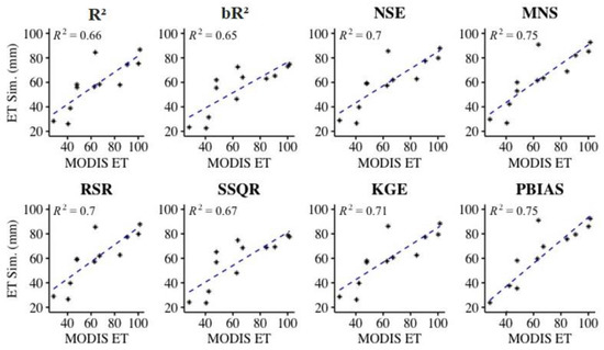 Linear regression between monthly average evapotranspiration obtained from the simulation results (ET Sim.) of different objective functions and monthly average evapotranspiration obtained from MODIS ET.