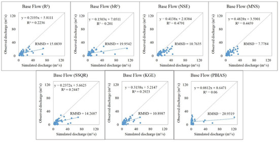 Figure 8 presents the scatter plots of the simulated versus observed discharge of base flow period for different objective functions. All of the objective functions generally overestimated the base flows. This behavior can be explained by the small fitted parameter values of GWQMN below 3000 mm as generated by many of the objective functions and the small fitted parameter values of GW_REVAP below 0.05 as defined by some of the objective functions (Table 5). A study conducted by Rafiei Emam et al. [49] in central Vietnam, which is also predominant by forest, defined the final range for GWQMN between 3133 and 3756 mm. However, among them, NSE and MNS objective functions produced better simulation results for the base flows with higher R2 values, better slope (optimum value of 1) and intercept (optimum value of 0), and smaller RMSD value. The simulated base flows of the MNS objective function achieved an R2 of 0.45, slope of 0.48, intercept of 3.59, and RMSD of 7.78, whereas the simulation results of the NSE objective function provided a value of R2 of 0.48, slope of 0.41, intercept of 2.84, and RMSD of 10.76.