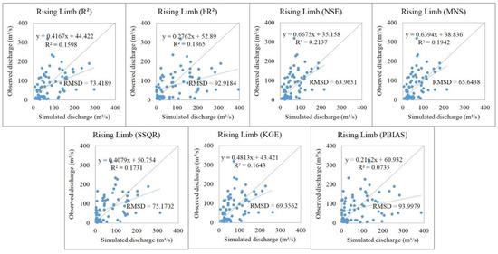 For the rising limb estimation, none of the simulation results of these objective functions showed a reasonable correlation with the observed data with an R2 of 0.21 at most and large intercepts; however, the correlation slopes of some of them reached a value that was greater than 0.6. Again, NSE objective function provided the closest simulation results (Figure 9) with R2, slope, intercept, and RMSD values of 0.21, 0.67, 35.16, and 63.97, respectively.
