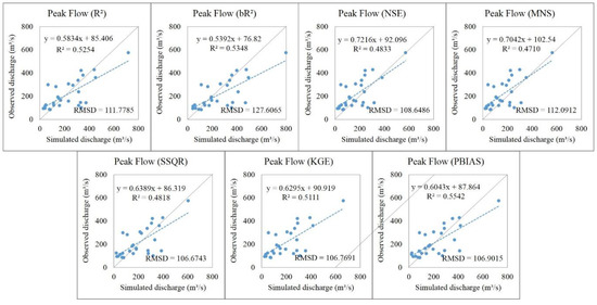 Conversely, the simulated peak flows of these objective functions gave a reverse performance result (Figure 10). The simulated peak flows of the PBIAS, bR2, R2, and KGE objective functions attained slightly higher R2 values compared to the results of the other objective functions at slightly larger than 0.50, whereas those of the remaining objective functions were a little less than 0.50. However, the regression slopes of the results obtained from the NSE and MNS objective functions reached a satisfactory value of above 0.70, and those obtained from the other objective functions were between 0.54 and 0.64. The intercepts obtained from all objective functions were between 76.82 and 102.54, and the RMSD values were between 106.67 and 127.61.