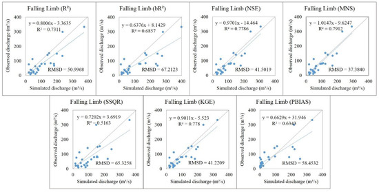 For the falling limb estimation, the performances of most objective functions were good (Figure 11). The MNS objective function performed well in simulating the falling limbs with an R2 of 0.79 with a good slope of 1.01, a small intercept of −9.62, and a RMSD of 37.38. The NSE and KGE objective functions performed similarly but were lower with an R2 of approximately 0.78 and RMSD of approximately 41. However, the regression slope and intercept obtained from the NSE objective function were at 0.97 and −14.46, respectively, whereas those obtained from KGE were 0.90 and −5.52, respectively.