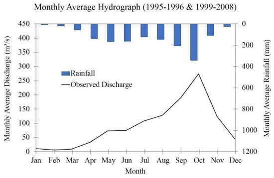 Monthly average hydrograph at Bak Trakuon Station during the calibration period from 1995 to 2008 (excluding 1997 and 1998 when rainfall data were missing).