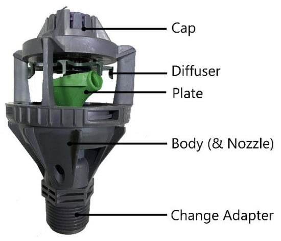 A low-pressure rotating sprinkler (Nelson R33LP; Nelson Irrigation Co., Walla Walla, WA, USA) with three nozzle diameters of 4.4, 4.8, and 5.2 mm was used in the experiments. Figure 1 illustrates the components of the sprinkler. In order to determine the droplet characteristics under low working pressure, the operating pressure used in this study ranged from 100 to 300 kPa in intervals of 50 kPa, and the minimum working pressure was lower than the working pressure recommended by the manufacturer (175–350 kPa).