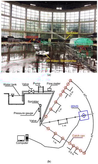 The indoor experiments designed to evaluate the droplet characteristics of the low-pressure rotating sprinkler were performed at the Irrigation Laboratory of the Research Centre of Fluid Machinery Engineering and Technology (Jiangsu University, Zhenjiang City, Jiangsu Province, P.R. China). The design of the experimental setup was in accordance with the ISO 15886-3 and ASAE S398.1 standards [,]. Figure 2 includes a photograph and schematic of the experiment. Water was supplied from a constant-level reservoir by a frequency pump (5 m3 h−1, 580 kPa). The discharge flow rate of the sprinkler was measured by an electromagnetic flow meter with an accuracy tolerance of 0.5%. The sprinkler was installed 1.5 m above the ground level, and an Asmik MIK-Y190 model pressure gauge (0–600 kPa, accuracy 0.4%) was placed 0.1 m under the nozzle. A pressure valve was attached to control the water head at the inlet of the sprinkler.