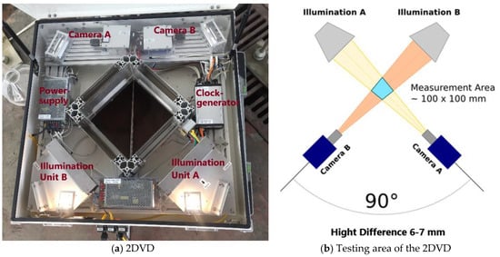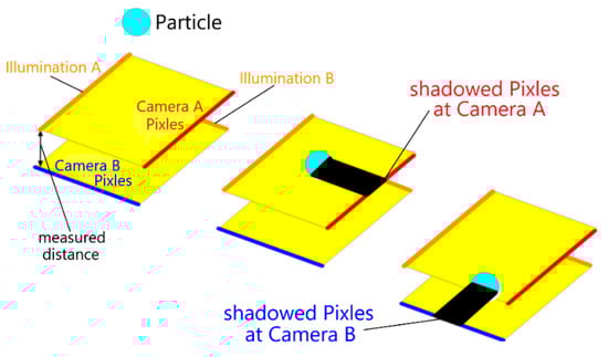 A two-dimensional video disdrometer (2DVD) (Joanneum Research Co., Graz, Styria, Austria) was used to measure the droplet size and velocity (Figure 2). As shown in Figure 3, two vertically disposed CCD cameras inside the instrument made linear scans of droplets passing through the test area and recorded the individual droplet size and the vertical and horizontal velocity components [,]. The measurement area of the 2DVD was 100 mm × 100 mm (Figure 3b), and its total height was 33 cm. The droplet size measurement principle of the 2DVD is illustrated in Figure 4; as water droplets passed through the test area, the widths of their shadows were scanned and recorded by the cameras, and the shadow widths were used to reconstruct each droplet’s shape in two dimensions. The two-dimensional shape of each droplet as determined by the two cameras was then used to reconstruct the three-dimensional shape of the droplet, and the droplet volume was also estimated. The droplet diameter was calculated using the equal volume of the sphere.
