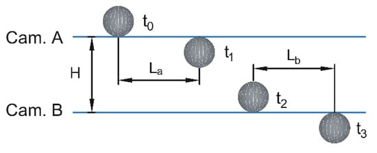 The water droplet velocity was determined by measuring the time required for the droplet to pass the two cameras (Figure 5). The measured velocity of an individual water droplet includes the vertical velocity and the horizontal velocity. The vertical velocity of a water droplet was calculated by Equation (1). The horizontal velocity of a water droplet was composed of the two-horizontal velocities of the droplet passing camera A and camera B, and the droplet horizontal velocity was calculated by Equation (2). The combined velocity of a water droplet was determined by the vertical velocity and the horizontal velocity, which was calculated using Equation (3).