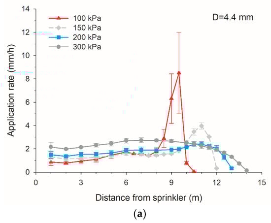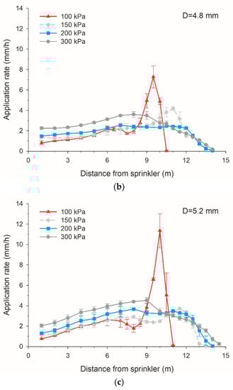 As shown in Figure 6, the error bars for the application rate for all nozzle sizes were largest under the lowest working pressure of 100 kPa, which illustrates a non-uniform water distribution in a circular direction. This can be explained because under the lowest pressure of 100 kPa, the impact force from the nozzle to the plate was not sufficiently large to overcome its resistance, and an unstable rotation was observed, which made the rotation speed randomly decrease; hence, the error bars became large. Therefore, the difference in peak error values for the three nozzles can be attributed to the different rotation speeds of the nozzles. At the lowest working pressure of 100 kPa, the peak error values for the application rate were 3.49, 1.08, and 2.17, and the sprinkler times per rotation were 184.86, 113.25, and 162.86 s (Table 1) for the nozzle sizes of 4.4, 4.8, and 5.2 mm, respectively. With an increase in working pressure, the impact force increased, the rotation speed of the sprinkler increased, and the error bars became small. Consequently, the rotation speed of the sprinkler influenced spray uniformity. If the rotation speed is unstable, the water distribution of the sprinkler is non-uniform in the circular direction.
