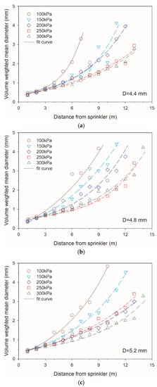 Droplets volume-weighted mean particle size (VMD) values versus distance from the sprinkler under different pressures. (a) D = 4.4 mm, (b) D = 4.8 mm, (c) D = 5.2 mm.