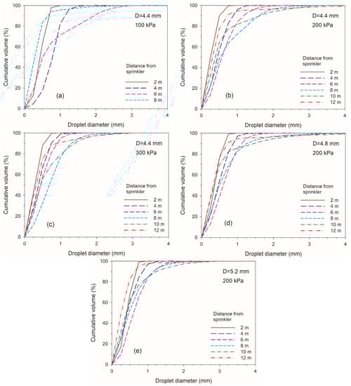 Droplet cumulative volume of the sprinklers with the nozzle size of 4.4 mm under the working pressures of (a) 100 kPa, (b) 200 kPa, (c) 300 kPa, and nozzle sizes of (d) 4.8 mm and (e) 5.2 mm under the working pressure of 200 kPa.