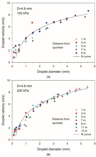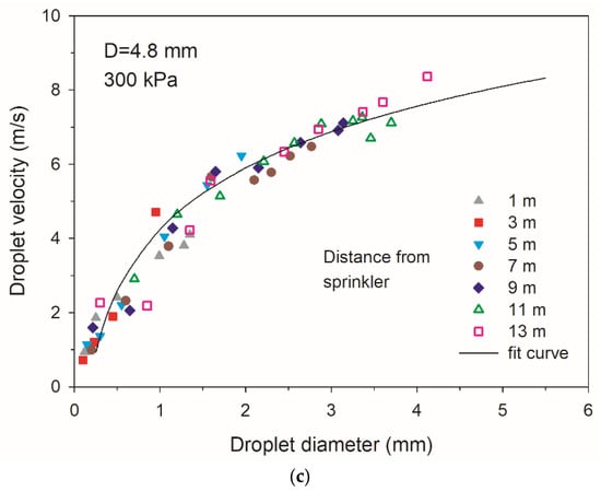 Droplet velocity is one of the important characteristic indexes that influence the droplet kinetic energy. Figure 9 represents the relationship between droplet mean velocity and the droplet diameter of the sprinkler with the nozzle size of 4.8 mm under three different working pressures. It can be seen that the droplet mean velocities increased as droplet diameters increased under different working conditions. An independent sample t-test was used to test the significance in droplet mean velocity under different droplet diameters and distances from the sprinkler. The results indicate that the effect of the droplet size on droplet mean velocity was significant (p < 0.01), but the effect of the distance from the sprinkler on droplet mean velocity was not significant (p = 0.143). In previous studies [,], a logarithmic relation was derived between droplet diameter and mean droplet velocity Equation (12).