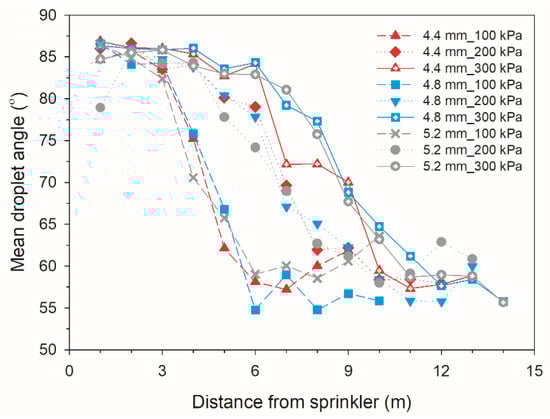 The mean values of the droplet angle versus the distance from the sprinkler are shown in Figure 10. Contrary to the results for droplet diameter and velocity, the mean trajectory angle of the droplets decreased with an increase in the distance from the sprinkler. Meanwhile, the mean trajectory angle of the droplets at the same distance from the sprinkler increased with increasing operating pressures. It can be attributed to the wetted radius increased with an increase in working pressure. Taking the nozzle size of 4.8 mm as an example, under the working pressures of 100, 200, and 300 kPa, the mean droplet angles at a distance from the sprinkler of 3 m were 84.24°, 84.75°, and 85.82°, those at a distance from the sprinkler of 6 m were 54.76°, 77.82°, and 84.30°, and those at a distance from the sprinkler of 10 m were 55.83°, 58.44°, and 64.73°, respectively. Due to the same elevation angle of the sprinkler plate for the three nozzles, the result of the significance test showed that the effect of nozzle size on the mean droplet angle was not significant (p = 0.734).