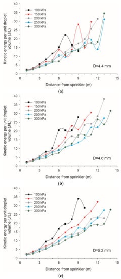 Per unit droplet volume kinetic energy distribution in different distances from the sprinkler. (a) D = 4.4 mm, (b) D = 4.8 mm, (c) D = 5.2 mm.