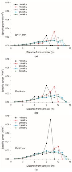 Specific power represents the rate at which kinetic energy is transferred to the soil surface; it is also referred to as droplet energy flux []. The radial SP of the low-pressure sprinkler was calculated based on the droplet diameter, droplet velocity, and water application rate at each sampling point (Figure 12). Under the low pressures of 100 and 150 kPa, along the wetted radius, the computed SP value increased and then decreased, with a peak value at a certain distance. When the working pressure increased from 100 to 300 kPa, the peak value of SP decreased, and the radial SP distribution of the sprinkler became more uniform. Under the working pressures of 100, 150, 200, 250, and 300 kPa, the peak SP values with the nozzle size of 4.4 mm reached 0.023, 0.033, 0.018, 0.012, and 0.013 W m−2, those with the nozzle size of 4.8 mm were 0.038, 0.036, 0.018, 0.015, and 0.017 W m−2, and those with the nozzle size of 5.2 mm were 0.091, 0.029, 0.022, 0.019, and 0.017 W m−2, respectively. The peak value of SP increased with an increase in the nozzle size under the same working pressure. Since the SP value depended on the water application rate, the effects of working pressure and nozzle size on SP were similar to those of pressure and nozzle size on the application rate. The maximum SP value was observed for the sprinkler with the largest nozzle size under the lowest working pressure in all cases, as illustrated in Figure 12.
