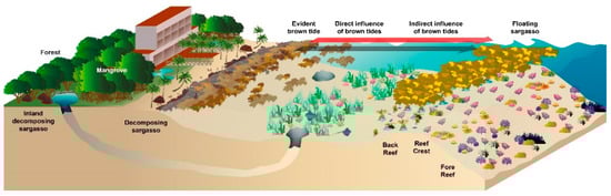 Schematic representation of the Mexican Caribbean coast profile and the impacts of the sargasso influx. Coastal ecosystems include: coral reef (back, crest and fore zones); seagrass meadows, algae and isolated benthic fauna (reef lagoon); beach; mangrove; forest; and underground rivers. When floating sargasso reaches the beach, if left on site, it decomposes after a couple of days, generating leachates and organic matter that reach the sea by wave action, creating brown tides that can affect the flora and fauna close to shore, directly, and the coral reef, indirectly. Inadequate disposal of sargasso in the mangroves and forests may contaminate underground rivers that eventually reach the sea.