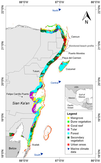 Coastal ecosystems (10 km strip) on the Mexican Caribbean. Data obtained from [18,19].