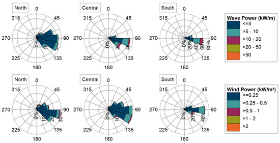 Charts showing the prevalent wind and wave power are presented in Figure 3. It can be observed that the predominant waves and winds are east–southeast in the north, and east in the south. Wave power values are mainly lower than 5 kW/m in the northern region. On the other hand, more energetic conditions are found in the south, where values of up to 20 kW/m occur with a probability of 60%. The same pattern is seen for wind power: more energetic conditions in the south than in the north.