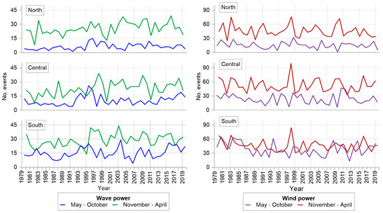 The seasonal variation of wave and wind power is shown in Figure 4, represented as the number of events that exceeded 10 kW/m and 0.5 kW/m2, respectively. The most powerful winds and waves occurred in the period from November to April (winter). The differences between the three sections of the coast were greater in the May–October periods than those of November–April.
