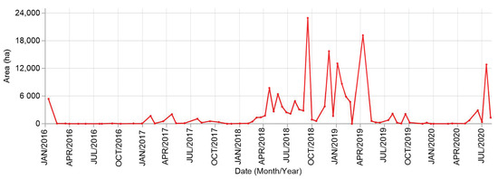 The maximum total coverage of oceanic sargasso mats for the period was 22,900 ha, recorded in September 2018, followed by 19,000 ha in April 2019 (Figure 5). Coverage was minimal from February to December 2016 (average area of 19 ha), and from November 2019 to April 2020 (average area of 44 ha). From February 2018 to June 2019, the presence of sargasso varied in abundance. In 2020, sargasso coverage was practically zero until the first sargasso mats were detected in May, increasing in July (6500 ha), and then falling in August. These results coincide closely with the temporal patterns of beached sargasso recorded on a small stretch of beach at Puerto Morelos by Garcia-Sánchez et al. [8] (Figure 6).