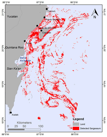 Satellite images of high spatial resolution, such as Sentinel 2 or Landsat 8, which provide high quality images (≈185 km × 185 km) over a broad spatial area are commonly used. Regarding the temporal resolution, Landsat 8 provides one image every 16 days and Sentinel 2, with satellites, gives an image every 5 days. After digital processing, the results are very reliable, and there is little chance of confusing sargasso with other floating features [54].