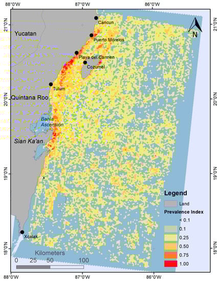 Prevalence index of sargasso in the Mexican Caribbean, January 2016–August 2020, detected with Landsat 8 imagery.