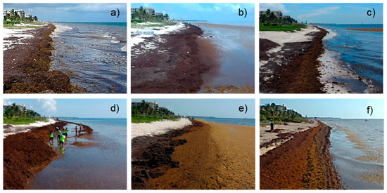 Sargasso accumulation and decomposition on a beach at Puerto Morelos: (a) October 2014, (b) August 2015, (c) July 2017, (d) August 2018, (e) October 2019 and (f) July 2020.