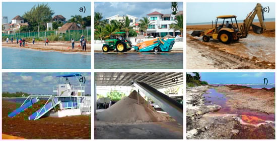 Removing beached sargasso from the Mexican Caribbean: (a–c) on the beach, and (d) in coastal waters. (e) Sand recovery in one of the hotels (huge amounts of sand are removed during sargasso clean-up activities on the beaches). (f) When large amounts of sargasso are left on the beach pools of leachates can be produced.