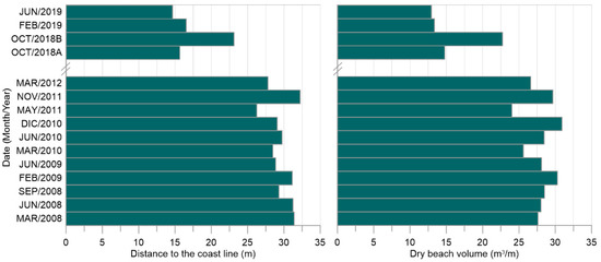 Coastline width retreat and dry beach volumes from 2008 to 2019, for a beach at Puerto Morelos.