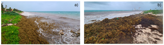 In 2011, large masses of the pelagic algae species of the genus Sargassum (S. natans and S. fluitans; described as sargasso from here) were reported for the first time floating in the North Equatorial Recirculation Region (NERR) of the southern Atlantic Ocean [1,2,3]. This new area of drifting algal masses, 8°–23°N and 89°–58° W, was named the Great Atlantic Sargasso Belt by Wang and collaborators [4], and by June 2018, its area had reached almost 3000 km2, with a biomass of >20 million tons [4]. On reaching the shores of Africa, the Caribbean and the Gulf of Mexico, these drifting masses caused severe environmental, economic and social impacts. In the Mexican Caribbean, massive influxes began to appear in late 2014, peaking in 2015, 2018 and 2019 [5,6,7,8,9].