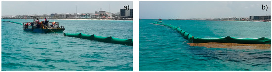 The location, dimensions and shape of the barriers depends on the oceanographic and geomorphological characteristics of the sites, but the aim is to concentrate the sargasso, thus facilitating its collection. U-shaped barriers are used to contain the sargasso (Figure 13), while V-shaped barriers (inverted triangle with angles of 45°–75°) are used to direct it to specific points along the beach for collection and disposal. The sargasso that accumulates in the U-shape barriers tends to decompose after 24–48 h and sink, so it may be carried under the barrier and towards the beach. To prevent this, the algae must be frequently removed using sargasso-boats. In the Mexican Caribbean the vessels used for this can remove 15–45 ton/h [97]. The sargasso that accumulates on the sides of U-shaped barriers, or on the extremes of the V-shaped ones, must be uploaded onto trucks, either with transportation bands or backhoes; the first is the preferred method, as the algae does not touch the sand. However, even where there are barriers in place, around 30–60% of the algae may still reach the beach. One concern of collecting sargasso in the sea is potential by-capture of associated fauna. However, Monroy-Velazquez et al. [82] found that the sargasso mats that had passed the reef contained mostly the small fauna typically associated with Sargasso, so extraction of this fauna does not affect local populations of the ecosystem. Extraction may even be desirable, because the associated fauna may include non-native species [82].