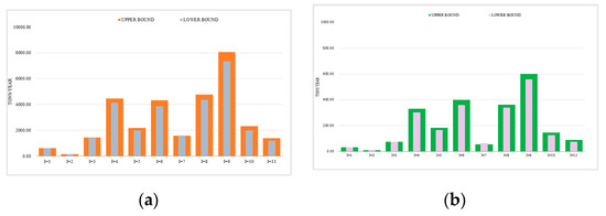 According to Table 9, in the third planning period, except for the industrial departments in Dehui and Nongan areas, the water shortage decreased in all the water use departments for all the areas. In the three planning periods, compared with the original model data, the upper and lower limits of water shortage in the industrial departments in Dehui, Yitong, Changchun and Nongan areas increased under low and medium available water resource levels. This is due to the income of water use in the industrial department is high and in the water resource distribution model of the Yinma River Basin based on the ITSP method, the stability and reliability of the system are seldom considered. In order to achieve higher economic benefits, excessive water resources are distributed to the water use departments with higher water use benefits. This causes the water resource distribution of the departments with low water efficiency and a high discharge coefficient to be lower than the water quota and restricts the development of the department. Thus, it leads to the problem of areal water use security [29].