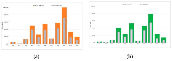 Optimal scheme of water resources distribution in the Yinma River Basin in the first planning period. (a) Upper bound of water resources; (b) Lower bound of water resources.
