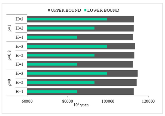 For example, under the level of low available water resources, when = 0, the economic benefit of the Yinma River Basin is [112,768.86, 84,648.95] × 104 ¥; when = 0.8, the economic benefit of the basin system is [112,359.35, 84,696.38] × 104 ¥; when = 1, the economic benefit of the basin system is [112,240.52, 84,696.38] × 104 ¥. It can be seen that with the increase of the robust coefficient, the economic benefit of the system decreases gradually. However, the system risk also decreases balancing the relationship between economy and stability. Although a part of the economic benefits is sacrificed while setting a high robust value to generate low economic benefits, it can improve the stability of the system [26]. It is shown that a higher level of robustness can be used to reflect the low-risk system failures. This means that high robust value and low economy can maintain s higher system reliability and the system with a higher level of robustness has a lower risk of system failure and can maintain higher system stability.