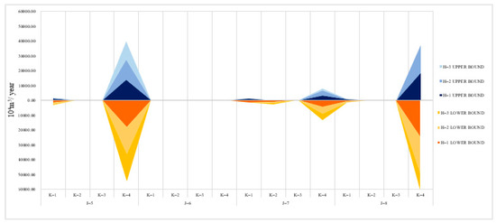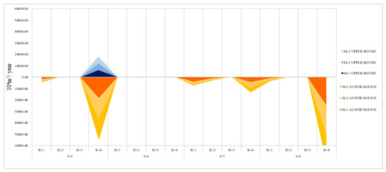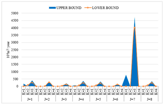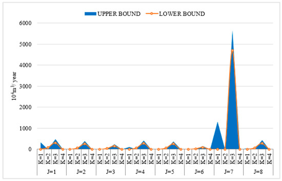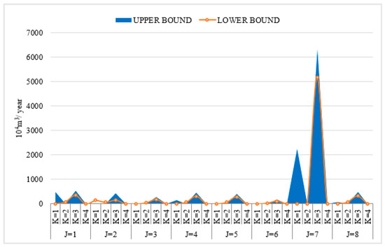 As shown in Table 8, in the second planning period, the levels of water shortage of the industrial department in Dehui area under three available water resources levels are [163.22, 2147.42] × 104 m3/year, [163.22, 1581.86] × 104 m3/year and [163.22, 988.65] × 104 m3/year, respectively. The levels of water shortage of the agricultural department under three available water resources levels for the same area are all [6062.65, 18,420.40] × 104 m3/year. The levels of water shortages of the industrial department in Yitong area under three available water resources levels are all [108.71, 131.50] × 104 m3/year. The levels of water shortage of the industrial department in Changchun city under three available water resources levels are all [0.00, 938.60] × 104 m3/year and the water shortage of the agricultural department under three available water resources levels are all [0.00, 4531.60] × 104 m3/year. The levels of water shortage of the industrial department in the Nongan area under three available water resources levels are all [0.00, 1177.00] × 104 m3/year and the water shortage of the agricultural department under three available water resources levels are all [0.00, 24,908.40] × 104 m3/year. Except for some of the water use departments in the above-mentioned areas, the upper and lower limits of water shortage in all the water use departments in other planning areas are 0. The water shortage of the agricultural department in Dehui area, Changchun City and Nongan area are 97%, 90% and 86% lower than that of the original model, respectively.