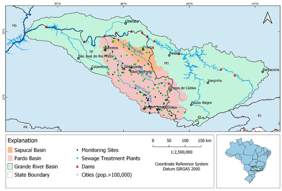 The Grande River Basin (GRB), which has a population of 8.6 million, with approximately 75% concentrated in urban centers, is one of the most important water resource regions in Brazil. In order to manage water resources in the basin in a sustainable manner, the National Water and Sanitation Agency and the Grande River Basin Committee developed the Integrated Water Resources Plan for the Grande River Basin [35]. Among the actions foreseen in this plan is the implementation of water-quality studies and identification of potential mitigation actions aimed at improving water quality in the basin. Specifically, the control of water pollution, especially related to specific constituents capable of causing eutrophication of reservoirs, such as nutrients, from both point and non-point sources, is a priority water quality management issue in the GRB, as nutrients are negatively impacting water quality in the basin. Effective control of water pollution requires information about constituent sources to allow for prioritization of areas where appropriate actions can be taken to avoid and mitigate unwanted impacts on water quality at the basin scale.