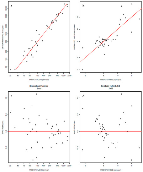 Model diagnostic plots showing (a) observed versus predicted loads, (b) observed versus predicted yields, (c) log residuals versus predicted loads, and (d) log residuals versus predicted yields for conditioned predictions.