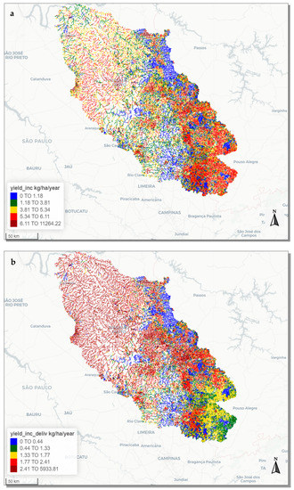 Mean incremental and mean delivered incremental TN yields predicted by the model are shown in Figure 3. The incremental yields are the yields generated within each incremental catchment, and the delivered incremental yields are the yields generated within each catchment that are delivered to the outlet of the Pardo-Sapucaí sub-basins after accounting for nitrogen losses in streams. The median incremental TN yield from the 68,856 reaches in the watershed was 4.66 kg/ha/year (interquartile range: 1.97–6.10 kg/ha/year). Some of the largest incremental yields were estimated for streams in the southeast portion of the watershed (Figure 3a), where pasture land is prevalent. However, due, in part, to the fact that this part of the watershed is furthest from the outlet, with the nitrogen loads subject to larger losses during transport to the outlet, this portion of the watershed displays lower delivered incremental yields relative to other parts of the watershed (Figure 3b).
