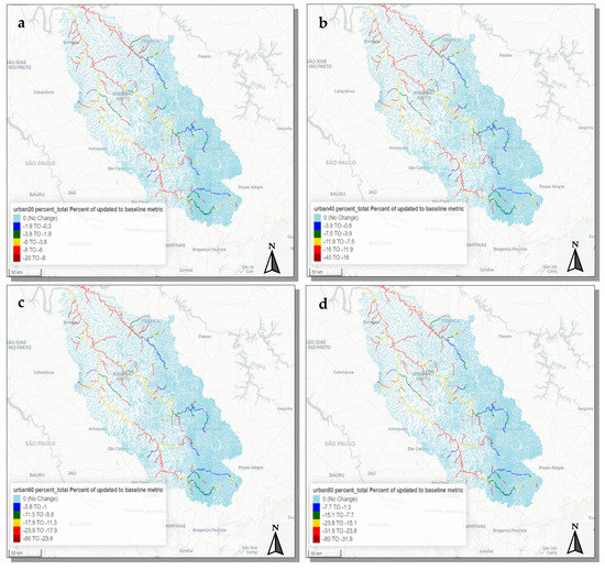 Another management-relevant result obtained from the SPARROW model is that both urban land area and wastewater treatment plants were identified as being significant sources of TN to streams in the Pardo-Sapucaí sub-basins. Given the fact that wastewater treatment plants are generally co-located with urban areas, the ability of the model to distinguish between these two sources indicates the strength of these source signals. From a management perspective, this result suggests that the capture of urban runoff (e.g., unsewered residences, stormwater runoff) and the construction of new wastewater treatment facilities, or other technologies like green infrastructure, to remove TN from the currently untreated urban runoff may be an effective approach for decreasing TN loading to streams in the basin. To test the potential effectiveness of such an approach, we used the DSS feature in the USGS RSPARROW software to reduce the TN loading per unit area from diffuse urban land source. Specifically, the urban land source coefficient was reduced by 20%, 40%, 60%, and 80% to represent the construction of new wastewater treatment plants that would remove the specified percent of TN loading from the current, baseline urban land source. Relative to baseline conditions, TN loading at the outlet of the Pardo-Sapucaí sub-basins decreased by 1100 tons (6%) for the 20% reduction in loading per unit area from diffuse urban land sources, 2200 tons (11%) for the 40% reduction scenario, 3300 tons (17%) for the 60% reduction scenario, and 4400 tons (22%) for the 80% source reduction scenario (Figure 5). These percentage reductions in the TN loads at the outlet of the Pardo-Sapucaí sub-basins, resulting from improved management of urban runoff, are generally similar to those associated with the reduction in point source loads, resulting from improved treatment at wastewater plants.