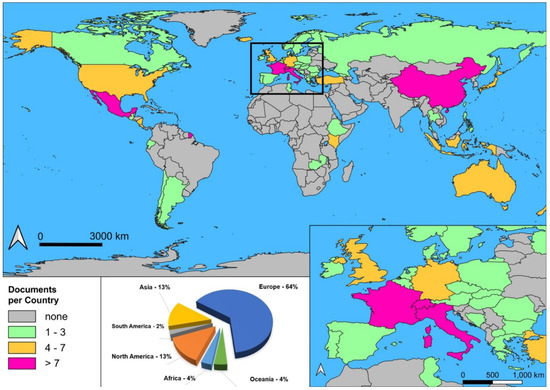 About 14% of the documents are theoretical, methodological or didactic, so that they are not geographically localizable. Considering the remaining documents, 64% of the total refer to Europe (Figure 1). The remaining documents concern America, Asia, Africa, and Oceania, in decreasing percentage order. Focusing on the country level, it should be considered that many documents concern more than one country. Of the database, 14% concerns all countries of the European Union, being mainly regulatory provisions. Excluding documents relating to all EU members and Italy, on which the research was detailed, the number of documents concerning France, Switzerland, Germany, and the UK prevails.