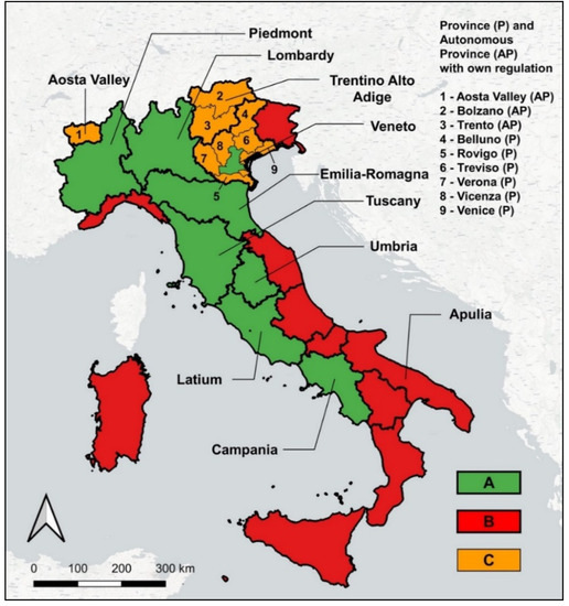 At present, there are regional laws and/or regulations for nine regions (of twenty) on LEG, from north-west to south-east: Aosta Valley, Piedmont, Lombardy, Trentino Alto Adige, Veneto, Emilia Romagna, Tuscany, Umbria, Latium, and Campania (Figure 2). In some of these regions, sub-regional provincial regulations were defined, as in the case of Veneto and Trentino Alto Adige, with a provincial gap in the case of Veneto. The complex Italian constitutional order includes some special provinces, called autonomous provinces. Their juridical rank is like the regional one: it concerns the Trento and Bolzano autonomous provinces, the union of which correspond to the Trentino Alto Adige Region.