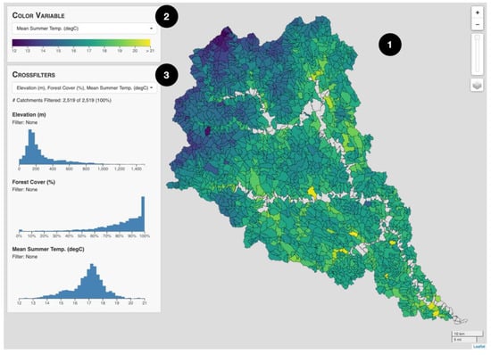 The user interface shows each of the three core ICE components: (1) a map showing the catchments, (2) a selection menu for choosing which variable is used to assign the color to each catchment (currently, the mean summer stream temperature) and (3) three crossfilters for the catchment elevation, percentage of forest cover and mean summer stream temperature (Figure 2). Catchments that do not have a color contain larger river segments, which were excluded from the stream temperature model and therefore have no value for the selected color variable (see Section 2.1.1). For each crossfilter, a histogram shows the distribution of the associated variable using 40 equal-width bins, with the height of each bar corresponding to the relative number of catchments within that bin. Vertical axes are not shown on the histograms because, as the user filters the dataset, the bars are automatically rescaled; thus, the tallest bar always has the same height as the chart.