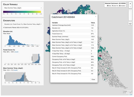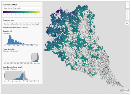 Screenshot showing the use of crossfilters to select catchments with forest cover greater than 80% and a mean summer stream temperature less than 17 °C.