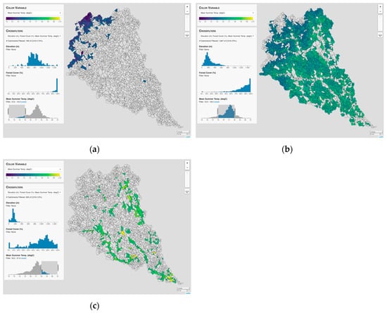 In addition to identifying catchments using multivariate criteria, crossfilters can also be used to dynamically explore the spatial distribution of a variable and to evaluate relationships between variables. Using the brushing technique, the user can modify a filter range by sliding it horizontally or by adjusting the start or end point to expand or shrink it. For example, a filter on the mean summer stream temperature can be shifted from an initial range of 12–15 °C to an intermediate range from 15–18 °C and finally to an upper range from 18–21 °C (Figure 4). As the filter range is shifted from left to right, the map shows how the spatial distribution of catchments changes as temperatures increase from low to high values. Similarly, the histograms for elevation and forest cover also update in response to the increasing temperatures.